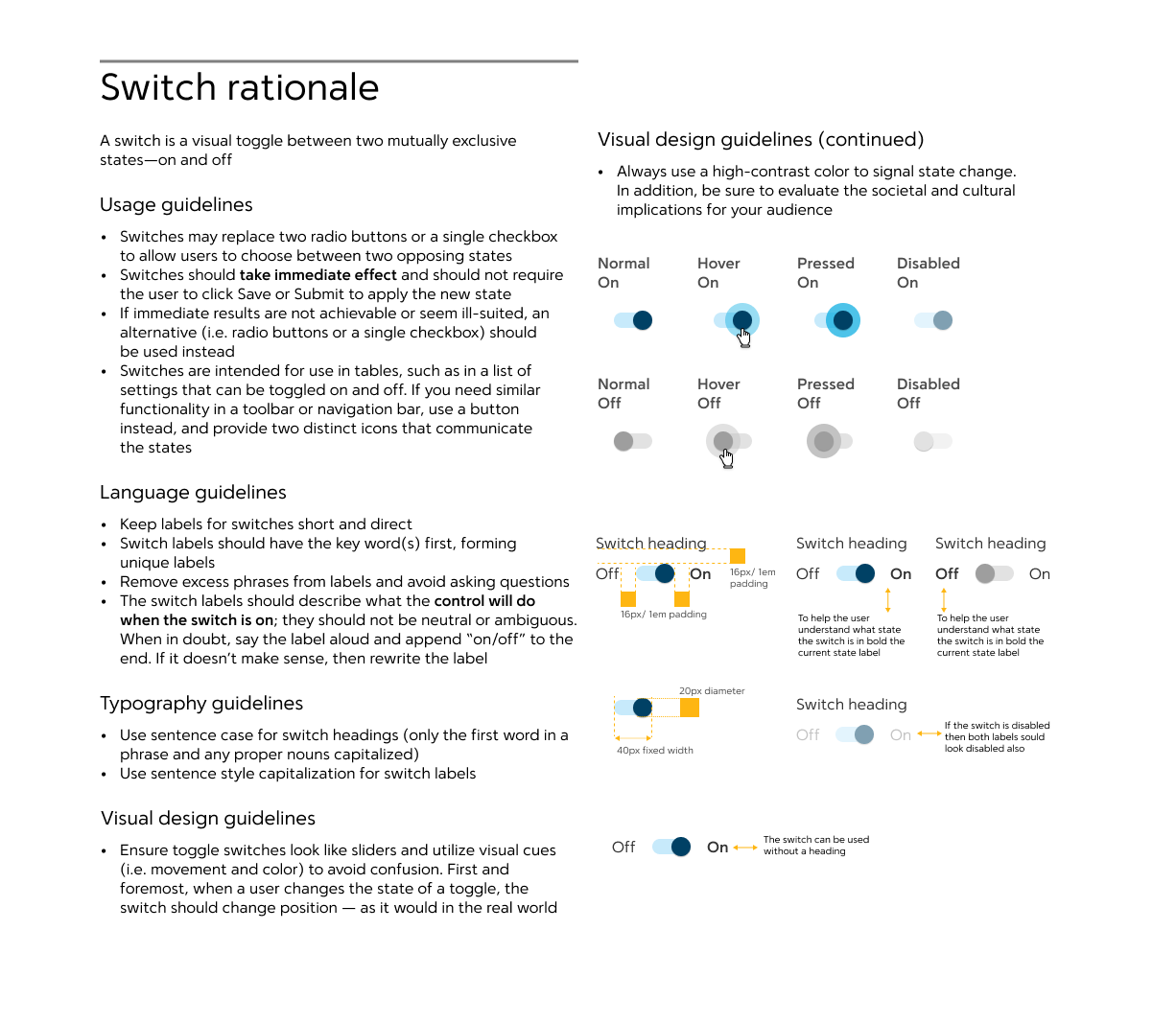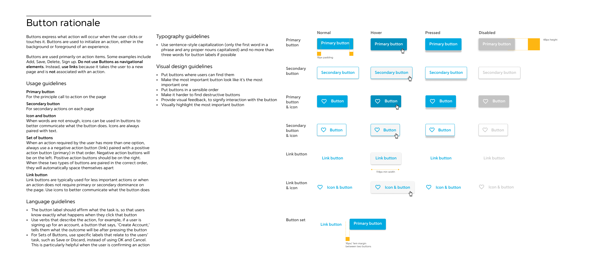 Visual design guidelines. Explain where components appear on a screen. Define different component states, e.g. hover, pressed, normal and selected. Think about dimensions and spacing